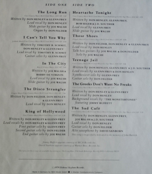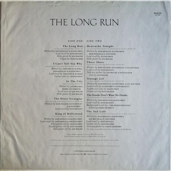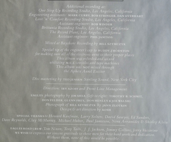 - Lead Vocals – Don Henley (tracks: A1, A4, A5, B2 to B5), Glenn Frey (tracks: A5, B1, B3), Joe Walsh (tracks: A3), Timothy B. Schmit (tracks: A2)
