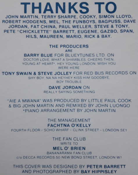 - Producer – Barry Blue (tracks: A2, A3, A5, B2, B4, B6), Dave Jordan (tracks: A4), Big John Martin* (tracks: B1), Little Paul Cook* (tracks: B1)