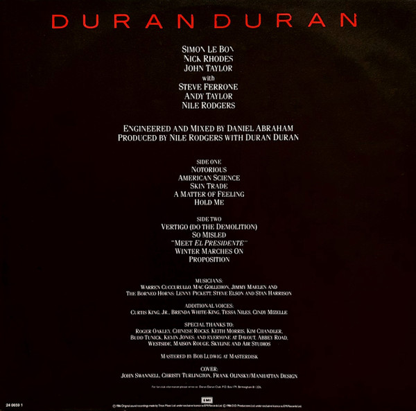 Some copies have "DURAN DURAN" embossed in silver, other copies have "DURAN DURAN" printed in grey on front/back side of the outer sleeve.