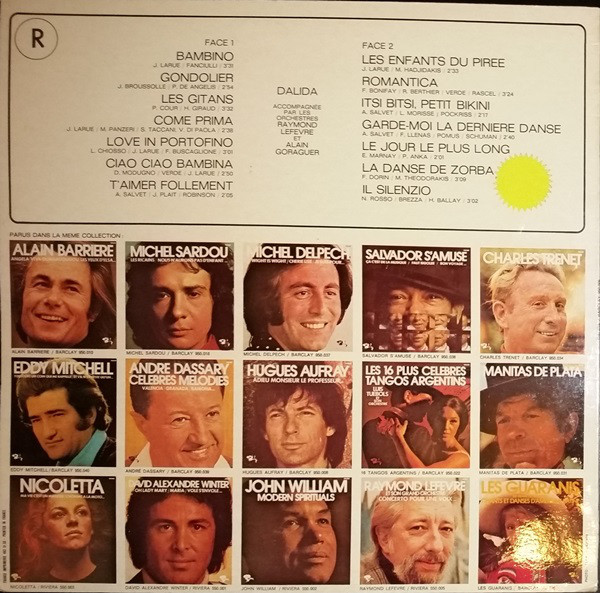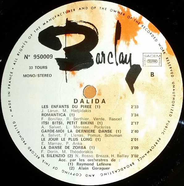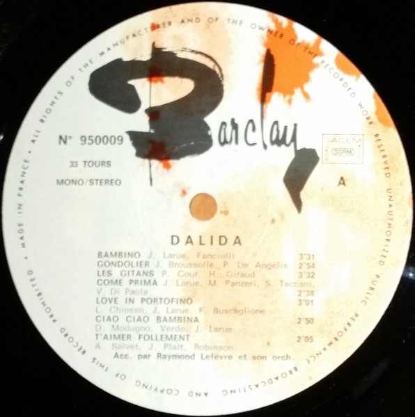 Issued on original Barclay labels. Another version was later issued with black Barclay labels (late 70s repress) as Dalida.