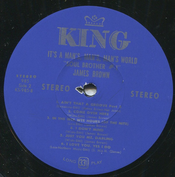 Cover has embossed lettering around the edges of JAMES BROWN with the photos inside of it on lower 2/3 of cover, unlike this non-embossed cover stereo version of James Brown - It's A Man's Man's World: Soul Brother #1.