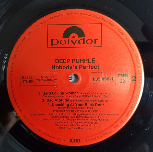 Manufactured in Germany in a gatefold cover, without embossed stamp [PRS Hannover], very similar to Nobody's Perfect with embossed stamp [PRS Hannover] on back cover.
