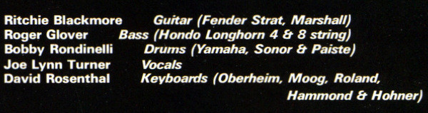 - Written-By – Bobby Rondinelli (tracks: B4), Rosenthal* (tracks: B2), Turner*, Blackmore*, Glover* (tracks: A2 to B1)