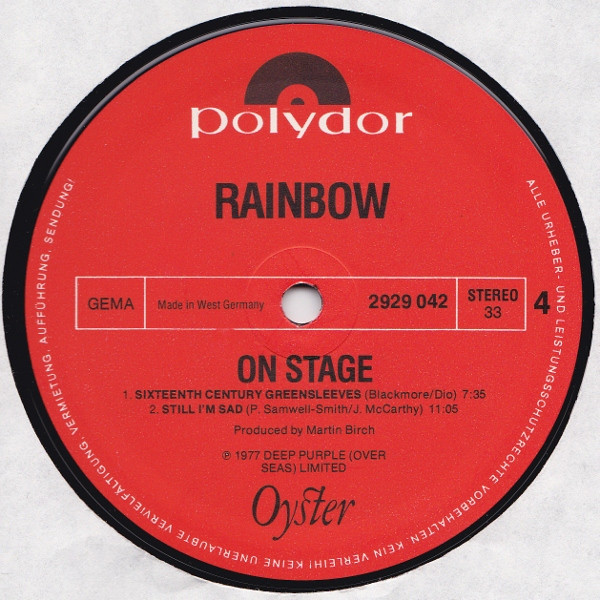 Some copies have a golden sticker "Live! Specially priced two-record set featuring Ritchie Blackmore Ronnie James Dio Cozy Powell".
