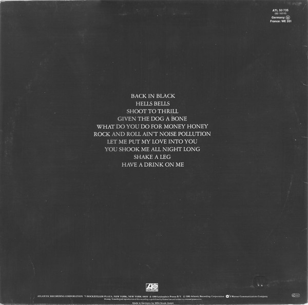 The inner sleeve shows black-and-white live pictures of the band members, except for Brian Johnson, who was new in the band at the time and had not performed yet with AC/DC.