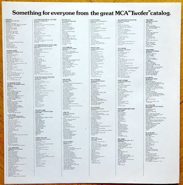 Comes with a four sided booklet with liner notes, track list and two sides a MCA "Twofer" catalog.
