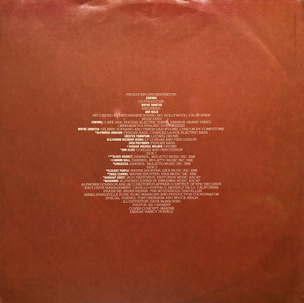 - Synthesizer [2 Arp 2600, Oberheim Polyphonic], Grand Piano [Yamaha], Electric Piano [Rhodes] – Joe Zawinul