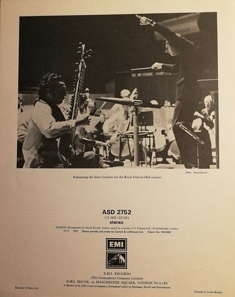 Ravi Shankar, André Previn, The London Symphony Orchestra - Concerto For Sitar & Orchestra has a B/W 'His Master's voice' logo on the labels, and 'Made in Gt Britain' at the bottom of the label. At the back of the inlay (bottom left) it says EMI/R & E/2/72'.