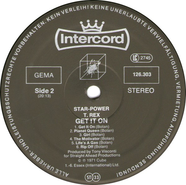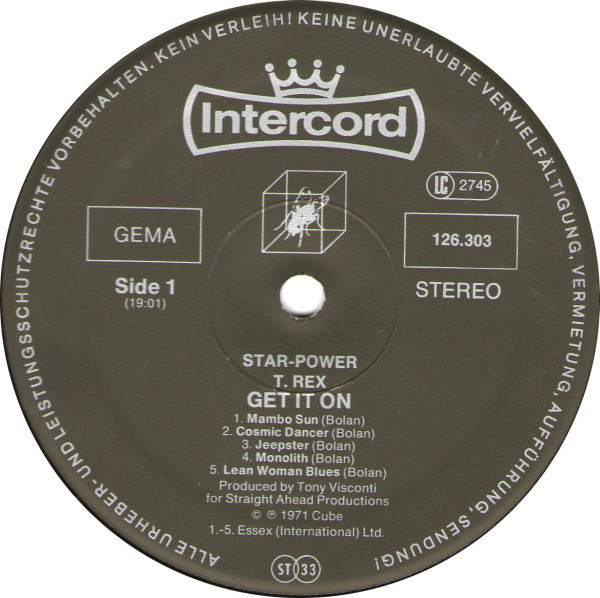 Star-Power reissue of Electric Warrior with unique frontcover design and different title. Basically the same as T. Rex - Get It On but with the catalog number of the original album Electric Warrior, although the runout shows the catalog number from T. Rex - Get It On.