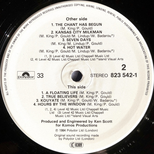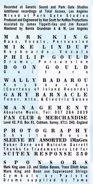 Mixed at Park Gate Studios, mastered at A & M, Los Angeles.