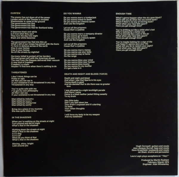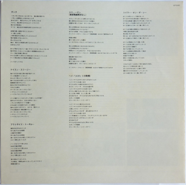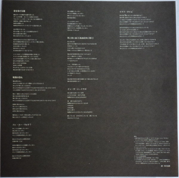 Issued with traditional obi, heavy stock printed inner sleeve and 4-page insert with lyrics/notes in Japanese. Track times from insert.