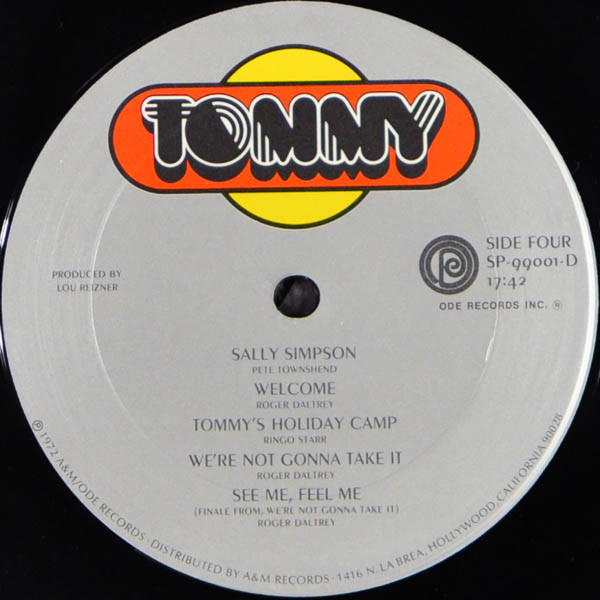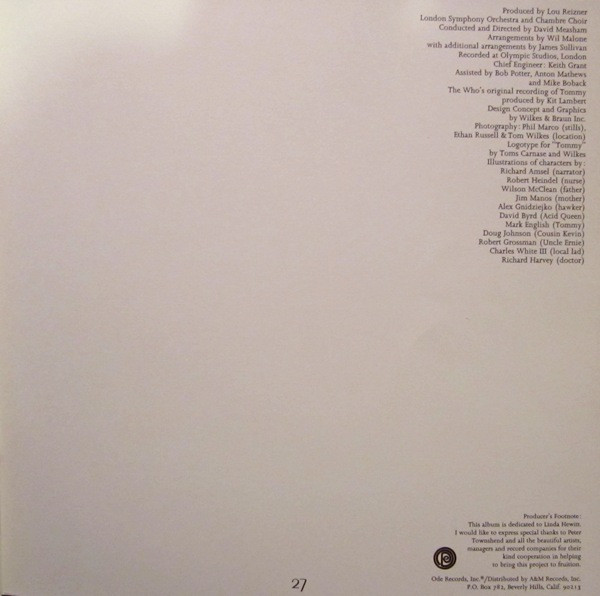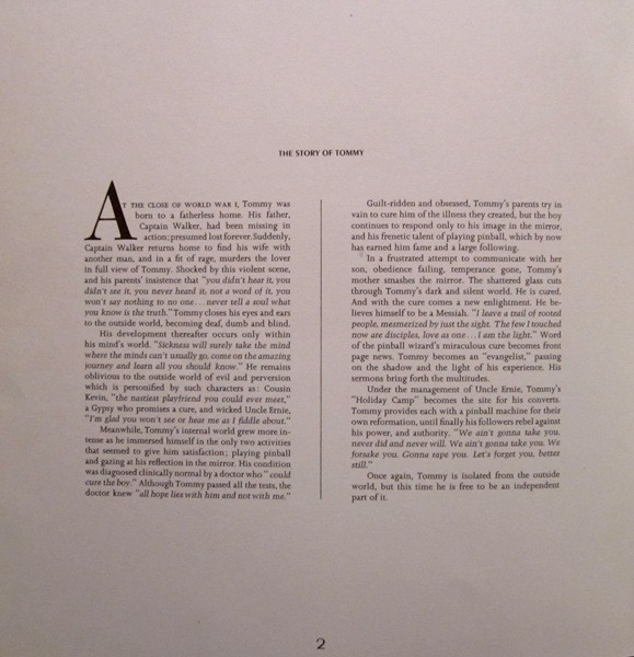 This came in a Hardboard slipcase with inner embossed gatefold sleeve. Enclosed is a 28-page 11"x11" full color booklet. "Story of Tommy" and appearance info, lyrics, and credits. Panels have color artwork and pinball machine related photos depicting story.