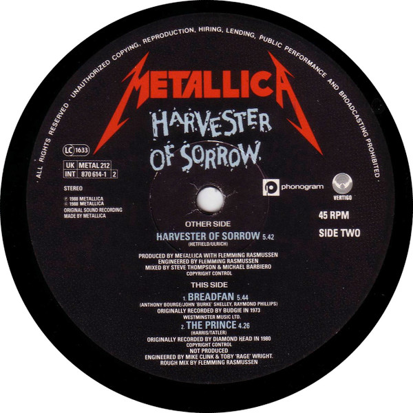 - Harvester Of Sorrow (METAL 212 / 870 614-1) Originally released: September 1988