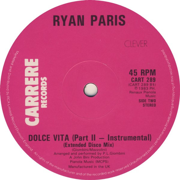 This variant has Bilbo etching for Lacquer Cut at Tape One, also the Side A runout area is large (20mm). It has identical sleeve and labels to the other pressing shown here: Ryan Paris - Dolce Vita (Extended Disco Mix) which was cut by JA and also has a smaller (12 mm) runout area.