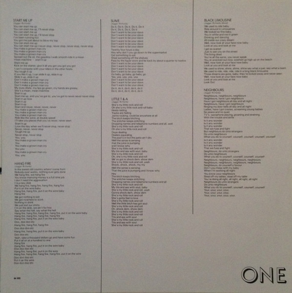 - Written-By – Jagger/Richards* (tracks: A1 to A4, A6 to B3, B5), Richards* (tracks: A5, B4), Jagger* (tracks: A5, B4), Wood* (tracks: A5, B4)