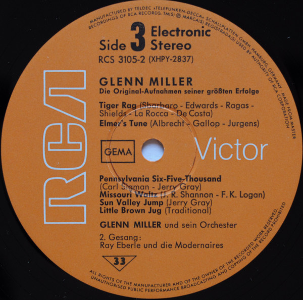 Made in Germany by RCA Schallplatten GmbH, 2 Hamburg 19 from master recordings of RCA