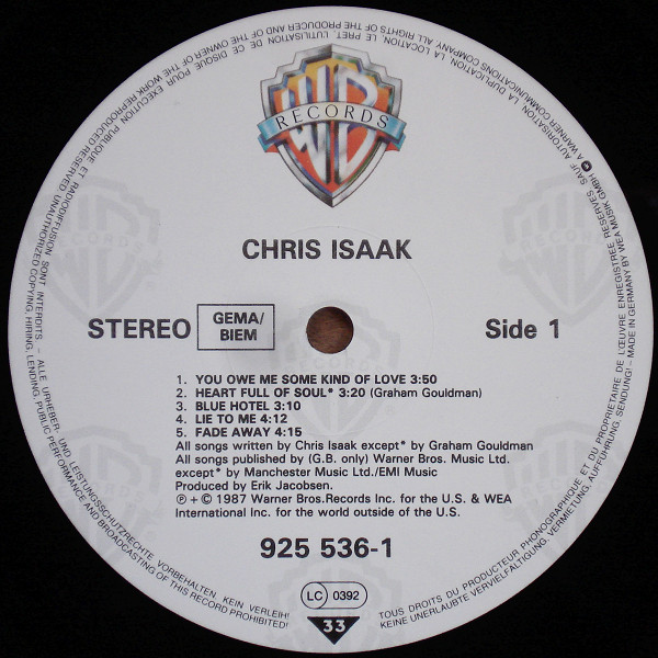 Issued with a printed inner sleeve including photos and credits - very similar to Chris Isaak - Chris Isaak, released without publishing credits on labels.