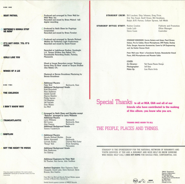 Mixed at Image Recorders except "Nothing's Gonna Stop Us Now" mixed at Tarpan Studios (San Rafael, CA.)