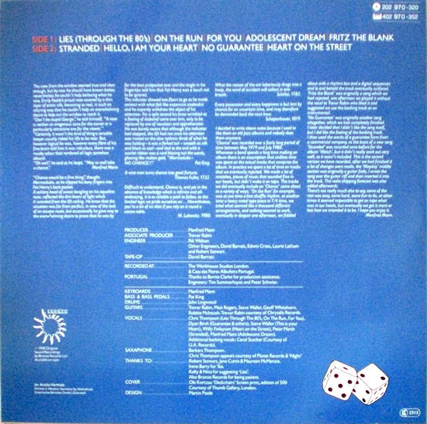 Side one: "On The Run" courtesy of Scalehand Ltd/Chappells Music Ltd/Pendulum Music Ltd © 1980, "For You" courtesy of Intersong Music Ltd © 1973, "Lies (Through The 80's)", "Adolescent Dream" courtesy of Scalehand Ltd © 1980.