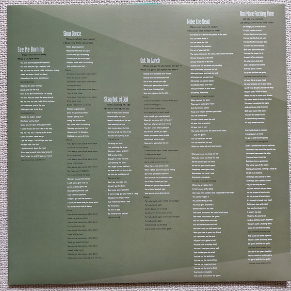 Printed inner sleeve of card, top opening with credits and lyrics.