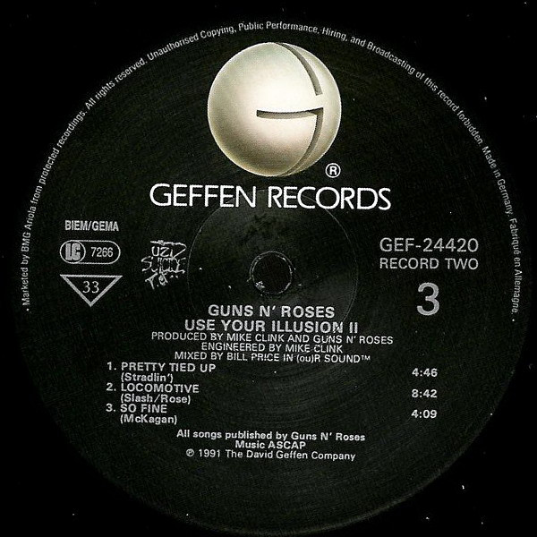 On the labels of this release, tracks B1 to D4 are credited to individual writers unlike the other Sonopress pressing Use Your Illusion II, which also has slightly different layout and publishing credits on labels.