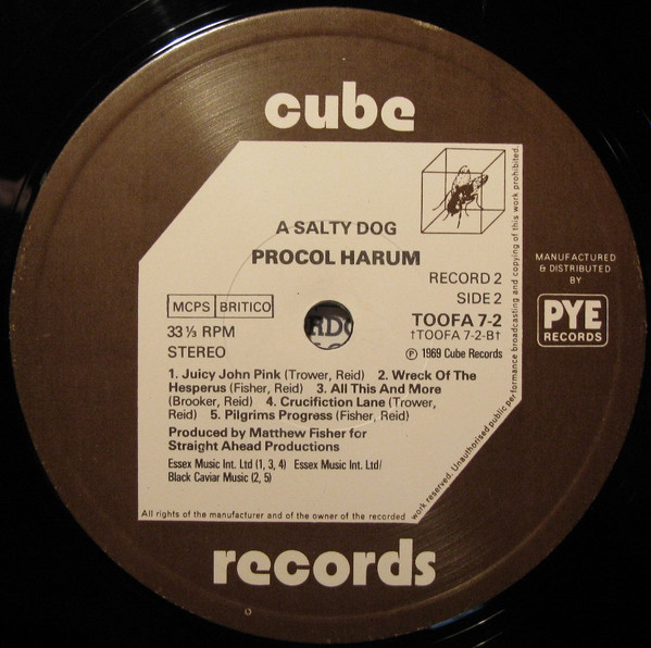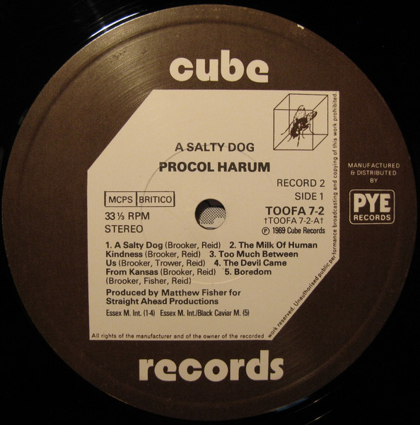 From Cube Records Toofa series, this has two studio albums packaged as one double. Side A & B "A Whiter Shade Of Pale" (1967, TOOFA 7-1 Mono). Side C & D "A Salty Dog" (1969, TOOFA 7-2 Stereo).