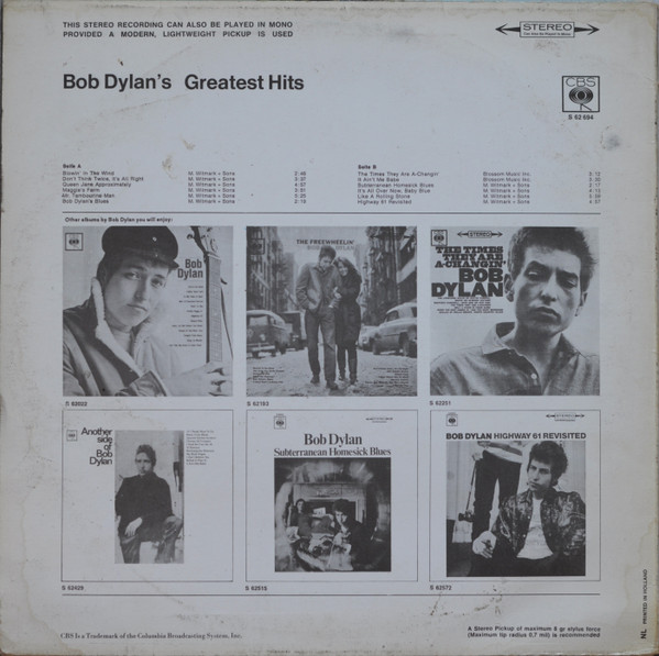 Very similar to release Bob Dylan - Bob Dylan's Greatest Hits but without Price Code and right upper corner detail.