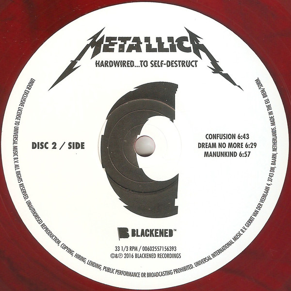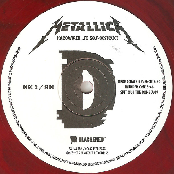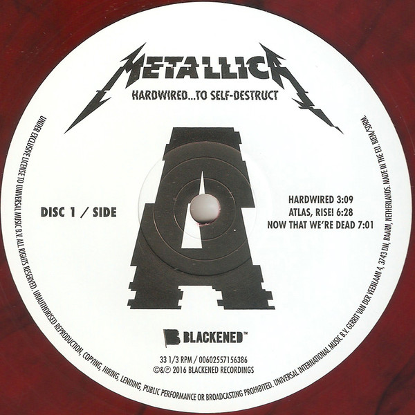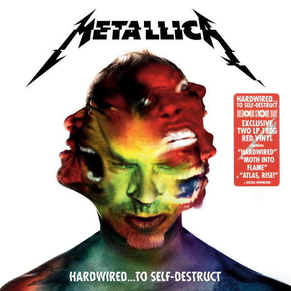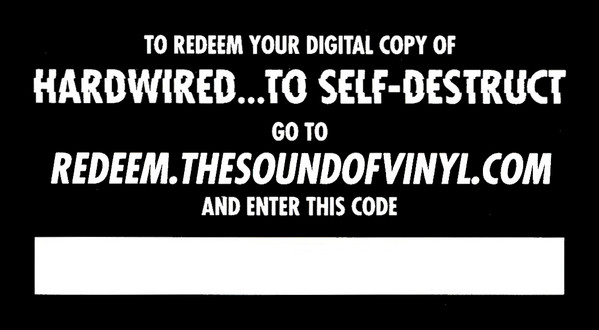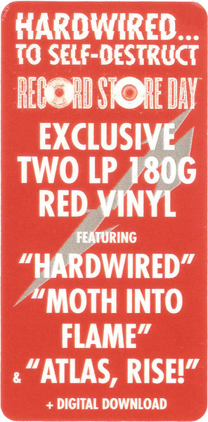 Sticker: "Hardwired...To Self-Destruct Record Store Day. Exclusive two LP 180g Red Vinyl. Featuring "Hardwired" "Moth Into Flame" & "Atlas, Rise!" + Digital Download"