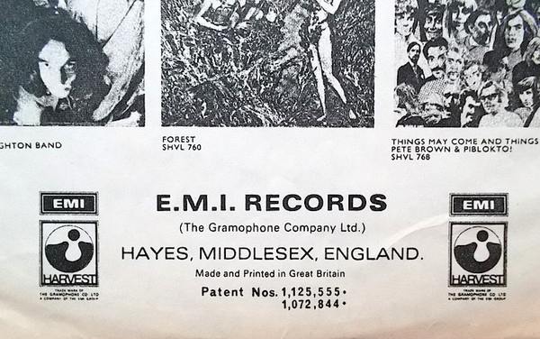 All 1st pressings come in a 'polylined' EMI/Harvest inner sleeve depicting other artists' current releases on the Harvest label.
