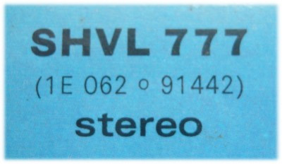 - Inscriptions (on the right side of the label) 'STEREO', 'SHVL 777' and '(SHVL.777A or B) 33 1/3' are located one above the other and have an equal gap between them.