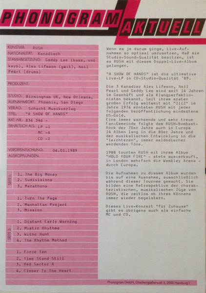 - Written-By – Lifeson* (tracks: A1 to C3, D1 to D4), Lee* (tracks: A1 to C3, D1 to D4), Peart*, Dubois* (tracks: D1)