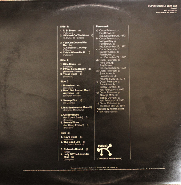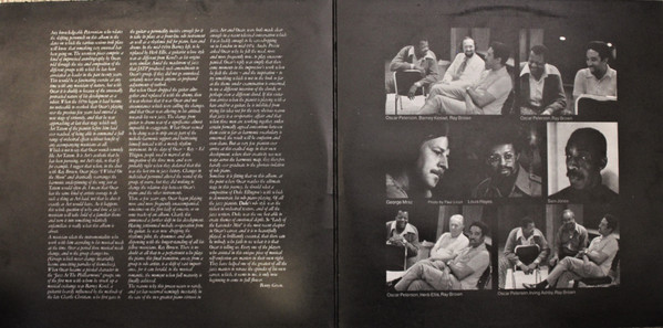 Gatefold sleeve, liner notes in English, features 7 black/white photographs featuring Oscar Peterson, Barney Kessel, Ray Brown, George Mraz, Louis Hayes, Sam Jones, Herb Ellis and Irving Ashby