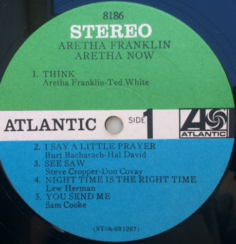 Label variation: original green and blue labels with boxed Atlantic black fan logo at right. Matrix at bottom of labels has no suffix (i.e. it ends with a number) and catalog number at top of labels is just 8186, unlike cover which shows SD 8186 catalog number. A similar pressing exists with SD number on labels: Aretha Now.