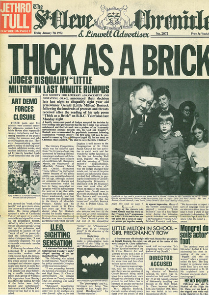 Gimmick gatefold and accompanying insert designed as a 12 page foldout newspaper which Anderson stated took longer to complete than the music.