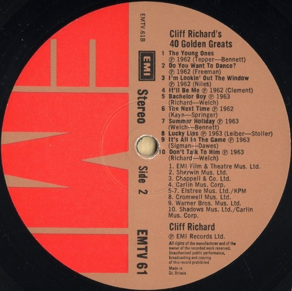 This entire compilation credited only as Cliff Richard, however, as these are the original recordings, the correct artists are given as released in the UK. Details taken from "The Guinness Book Of British Hit Singles".