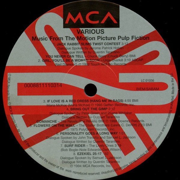 - Pulp Fiction (Music From The Motion Picture) has a back cover with 7 lines of copyright info and different runouts.