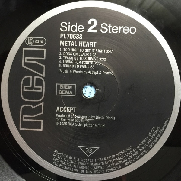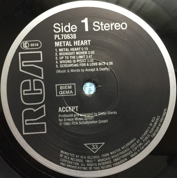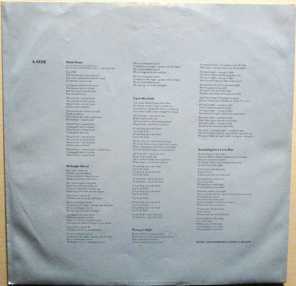 The same as Accept - Metal Heart, but "All titles published by Breeze Music GmbH/Schacht Musikverlage Germany"