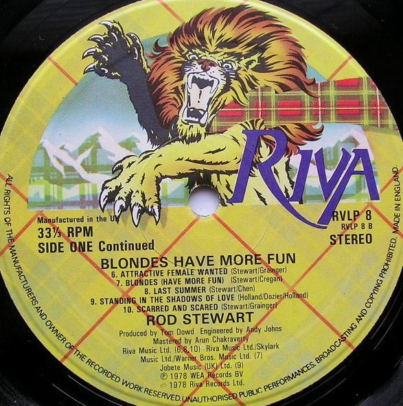 This version has a similar label layout ('Side One/One Continued' side identifiers) as Blondes Have More Fun but this has Skylark Music Ltd. publishing credits.