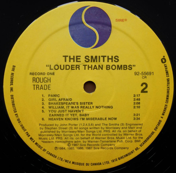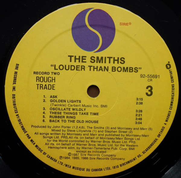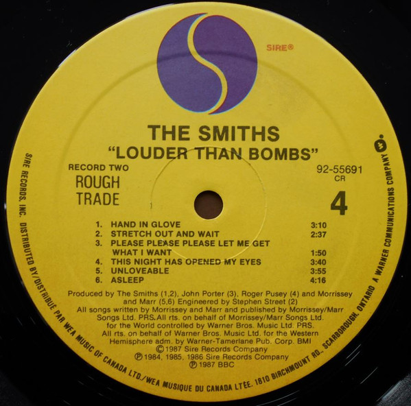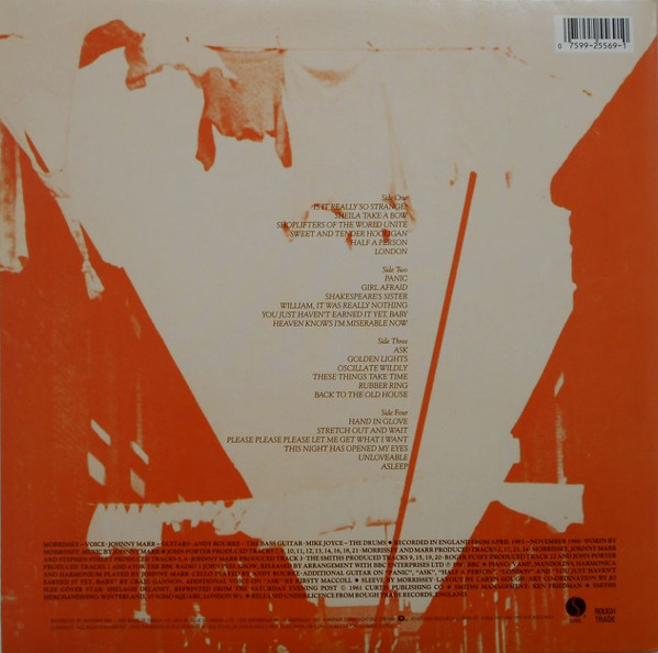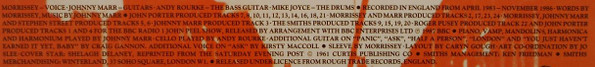 All songs © 1984 (tracks B2, B4, B6, C4, C6,, D1, D3, D4), 1985 (tracks B3, C3, C5, D2, D6), 1986 (tracks B1, C1, D5) 1987 (tracks A1 to A6, B5) Morrissey/Marr Songs Ltd. PRS. All rights on behalfs of Morrissey / Marr Songs Ltd. for the World controlled by Warner Bros. Music Ltd. PRS. All rights on behalfs of Warner Bros. Music Ltd. for the Western Hemisphere administered by Warner-Tamerlane Publishing Corp. BMI except C2 ©1965 Carlin Music Corp., all rights for the U.S. and Canada administered by Carbert Music, Inc. BMI.