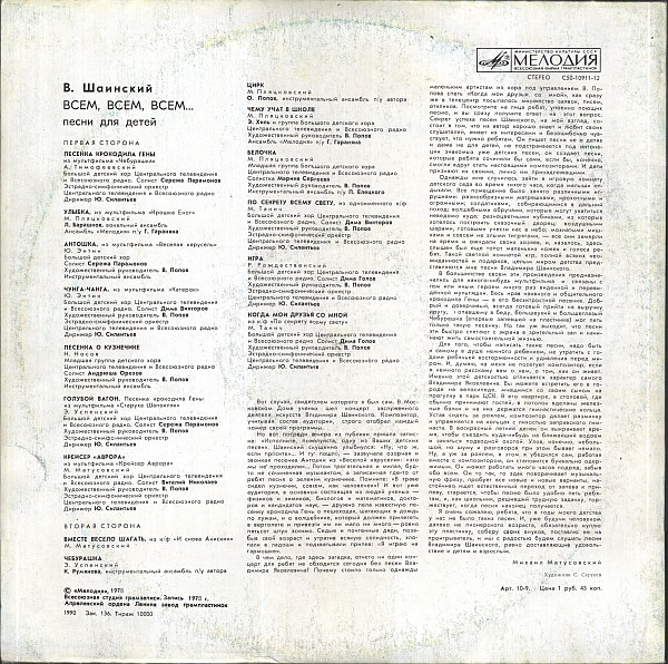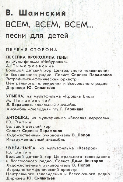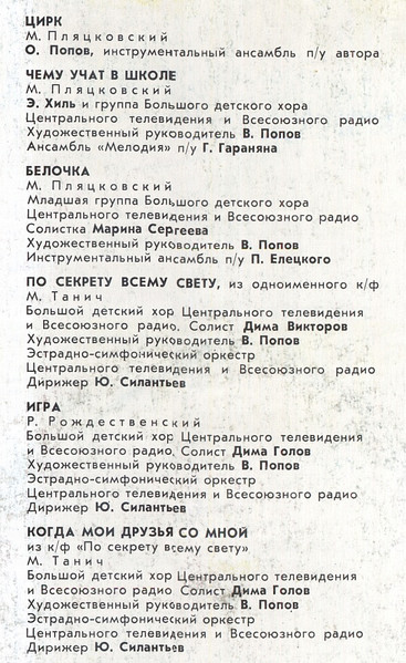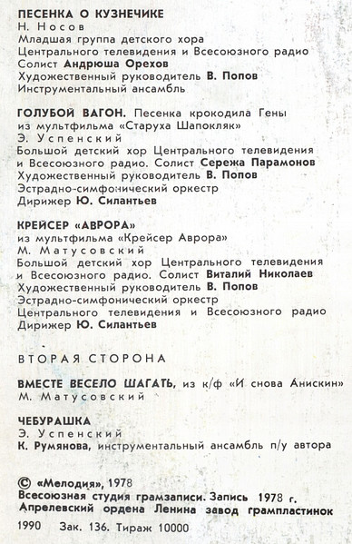 - Lyrics By – А. Тимофеевский* (tracks: A1), М. Пляцковский* (tracks: A2, B3 To B5), М. Танич* (tracks: B6, B8), Н. Носов* (tracks: A5), Р. Рождественский* (tracks: B7), Э. Успенский* (tracks: A6, B2), Ю. Энтин* (tracks: A3, A4)