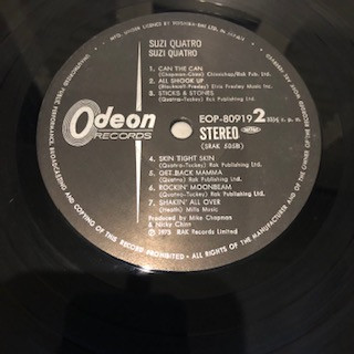 Gatefold sleeve with a big colour "live" photo of Suzi on the inner pages