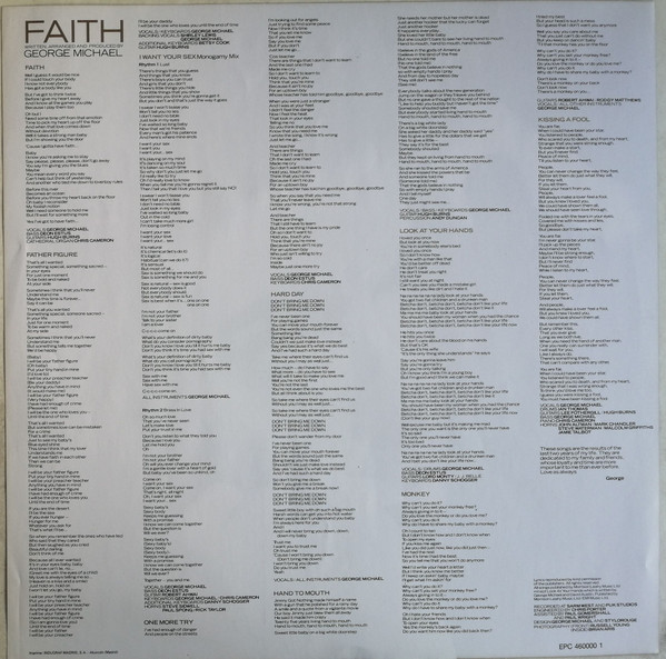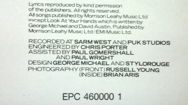 Sleeve with George pic on one side and album signs on the other. Also included a sheet with all songs lyrics on one side and George Michael face pic on the other.