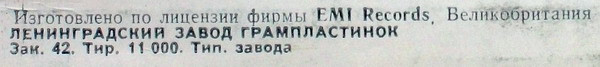 Изготовлено по лицензии фирмы EMI Records, Великобритания.