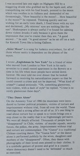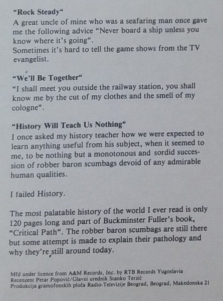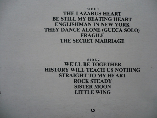 Rare release on single LP, both Yugoslav releases (also on audio cassette) have got track sequence unique in the world: they contain all twelve tracks as like common double LP releases but permuted, very probably in order to balance the track durations on each side to make mastering possible without any track omitting, thus the side 1 plays about 28 minutes and side 2 about 27 minutes. Includes 31cmX31cm four page booklet out of paper with monochromatic photographs (also unique in the world, they are colour ones elsewhere) and lyrics (in the original track sequence) - in fact a 62cmX31cm sheet of paper folded in the middle. Liner notes (obviously by Sting but not credited) and credits are printed on back cover. Another specific of the Yugoslav release is the strange fact that the liner notes are not identical to the ones on other releases in the world: notes about the song Fragile are completely omitted and there are some typos - "I fixed himm" instead of "him" in the note about album title; "deperted" instead of "deported" and "rerely" instead of "rarely" for Englishman in New York; "countri" instead of "country" for They Dance Alone.