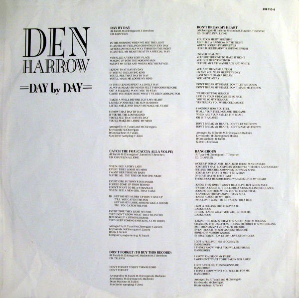 All songs published by Ed. Chapulin except "Don't Break My Heart" and "Catch The Fox (Caccia Alla Volpe)" by Ed. Chapulin / Allione, "Don't Forget (To By This Record)" by Ed. Televis.