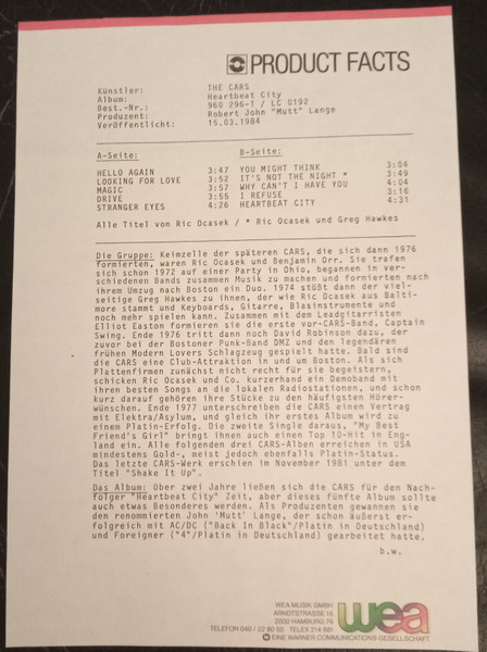 First copies sold in Germany with "wea product facts" promo sheets, March 1984.