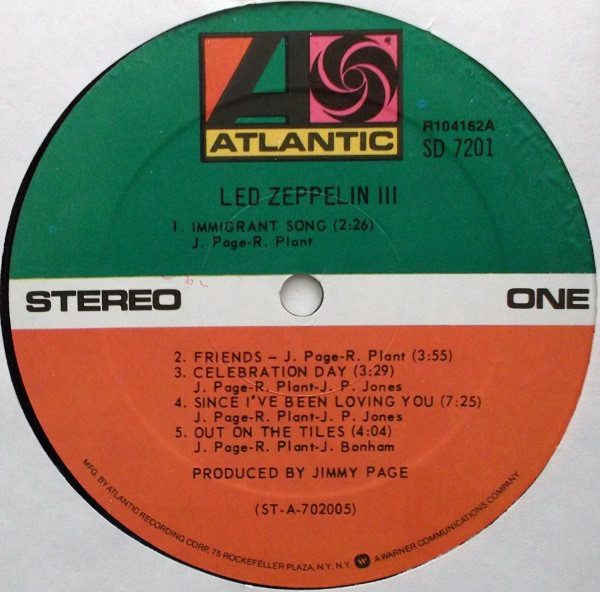 Reissue pressing of Led Zeppelin - Led Zeppelin III that shows the 75 Rockerfeller Plaza Address and Warner Communications logo.