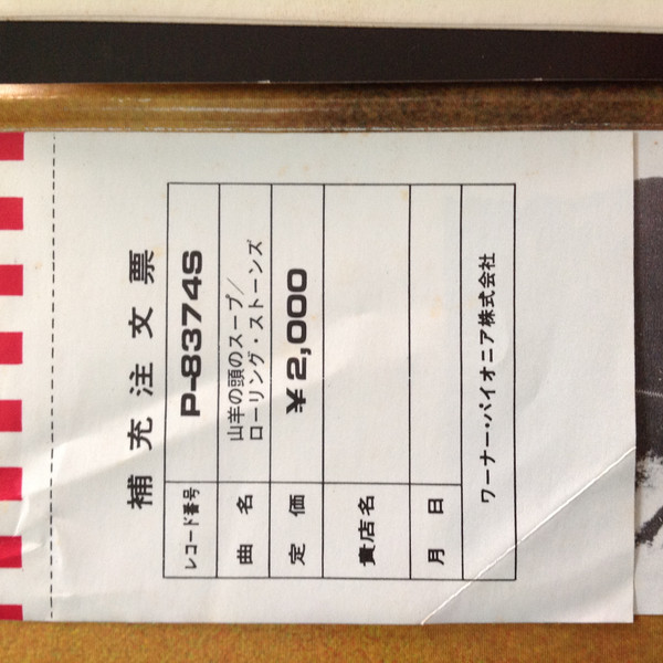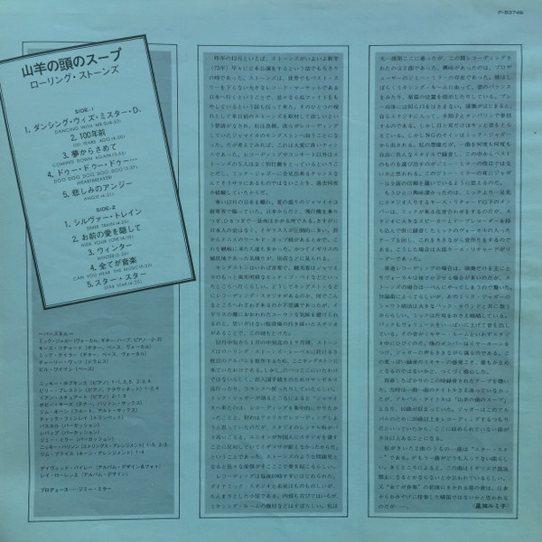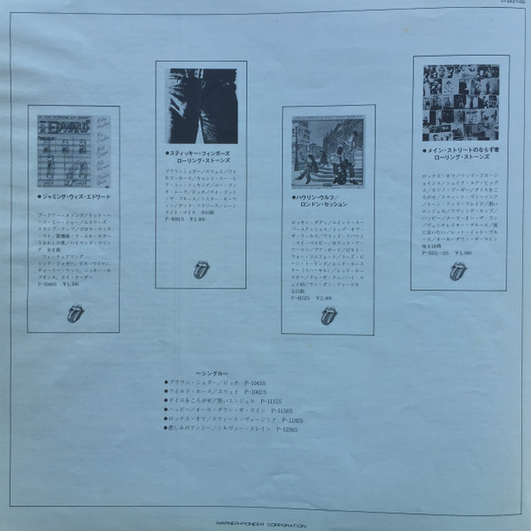 Gatefold sleeve with red & white obi, beautiful "super gloss" Goats Head print, printed sepia tone inner sleeve, and 4-page insert featuring Japanese liner notes, English lyrics, and mini-discography showing 4 other Rolling Stones Records releases (P-5046S, P-8091S, P-8152S, P-5051~2S).