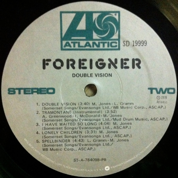 Third Pressing (1979): Purple tint to photo and "Double Vision" below the band name, which is purple.