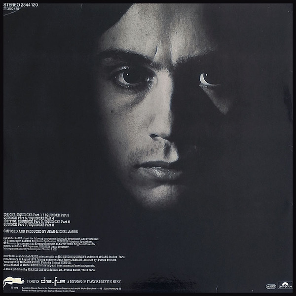 Equinoxe: red and blue labels with 'Made in West Germany' framed text, back sleeve with Jarre face photo